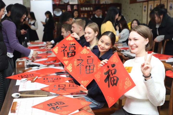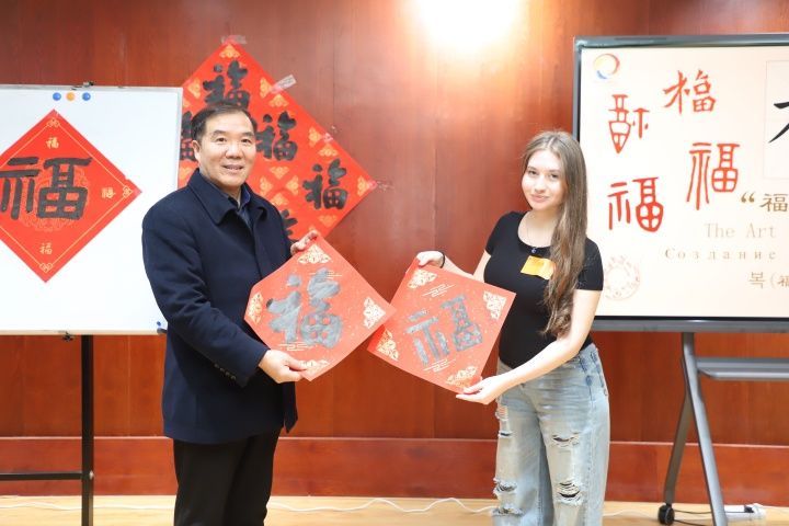 现场,青岛滨海学院教师、中国工笔画学会会员于周超,青岛滨海学院教师、中国美术家协会会员张立娜进行了“福”字文化讲解与书写示范。中外师生们分组提笔,满怀兴致地临摹书写“福”字,并以金粉、剪纸等创意装饰。中外学生互赠精心准备的多语言“福语书签”,小小书签传递着浓浓祝福。俄罗斯留学生安德烈在亲手书写后感慨:“这不仅让我学会了一个汉字,更让我真切感受到了中国文化中平安喜乐的温暖。这是我最珍视的‘福’气。”